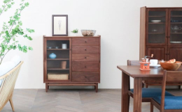 何に分類されるでもなく、増え続ける小物の数々。思い切って断捨離を・・・とは言っても、思い出の品だったり、いつか使いそうなものであったりと、なかなか進まないものです。そんな悩みをお持ちの方におすすめしたいのが、このサイドボード。左側にはかすみガラスの扉の収納棚、右側には深さの異なる引出しが5杯もついています。安定感のあるシンプルなデザインは、設置することによってむしろ安定感を生み、置き場所に困っていた本や置物なども見やすくたくさん収納できます。そしてすべての角を丸く加工することで、非常にやさしい雰囲気に。ふいに体をぶつけてしまっても、ケガをしにくい安全設計です。そしてこのサイドボードならではの魅力は、なんと言っても「かすみガラス」。うっすらと見える姿は、中身の確認と適度に隠すと