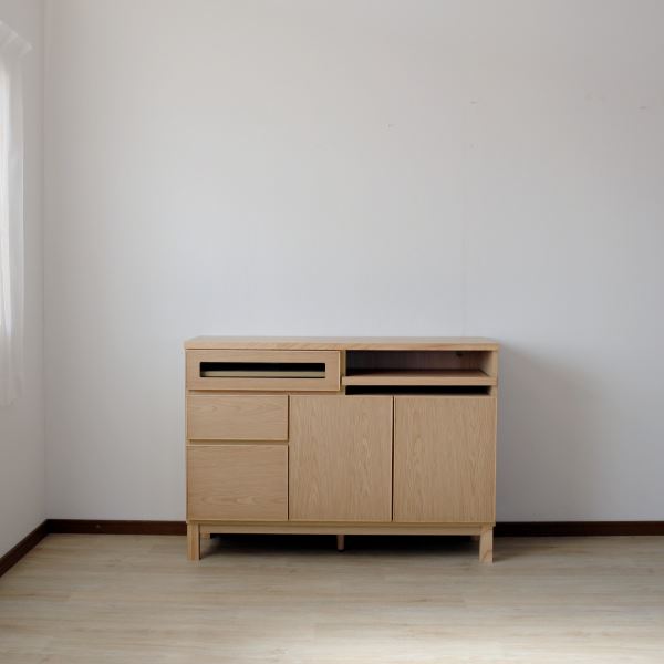 ■型番 / 商品名LILLSDB120 / リル 120サイドボード■商品サイズ幅119×奥行42.8×高さ80(脚部高さ:15)cm■素材[天板]オレフィン化粧板(マット調)[本体]MDF/強化シート▼オレフィン化粧板とは?オレフィンとはプラスチック樹脂の一種でフローリング等に用いられることが多い化粧板です。耐汚染性、耐水性に優れているので、家具では様々な部位で使用されています。■生産国日本製(大川家具)■特徴・天板には汚れや傷に強いオレフィン化粧板を採用・扉はゆっくり閉まるセーフティークローズ仕様・コード通し穴があるので充電が必要な家電やプリンター等が収納可能・背面化粧仕様で間仕切りとしても使用可能■備考完成品(脚のみ取り付け)【特長】ホテル、レストラン、民泊、宿、施設、オフィス、テレワーク、在宅、耐水、耐汚、コワーキング、受付け、ロビー