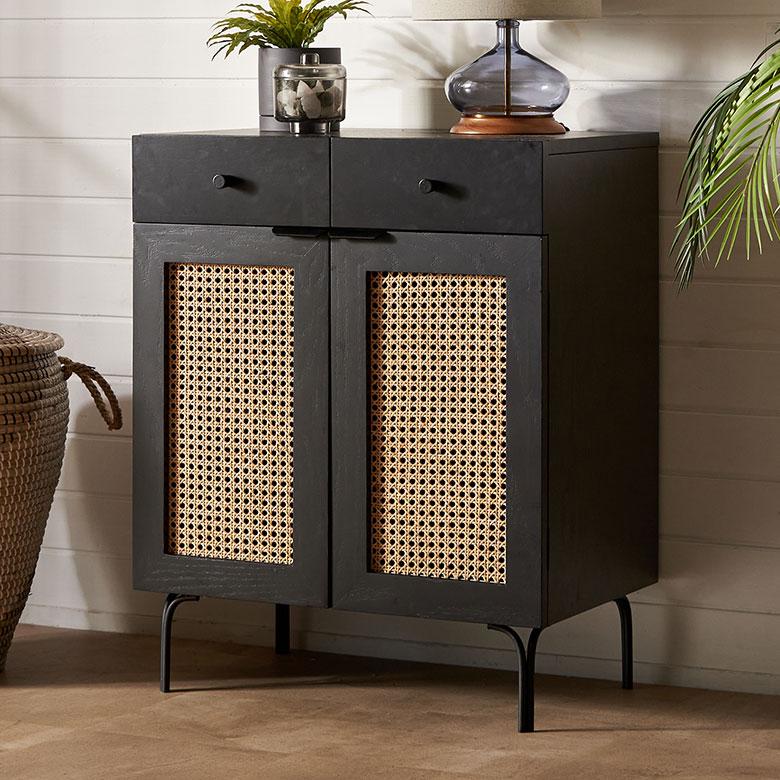 ■キャビネット 扉付き 収納棚 引き出し ラタン 収納 脚付き サイドボード リビング 家具 おしゃれ 食器棚 コンパクト 天然木 ワンルーム