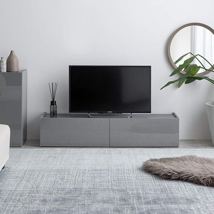 石目柄と鏡面の組み合わせが美しい『Anq(アンク)』シリーズのテレビ台。直線的なフラットデザインで、置くだけで落ち着いた大人な空間を演出します。また脚部は取り外しができ、脚あり・脚なしの2WAYで使用することが可能。さらにスリムなのに大容量収納ができ、フラット蝶番仕様で出し入れも楽にできるなど使い勝手も抜群です。