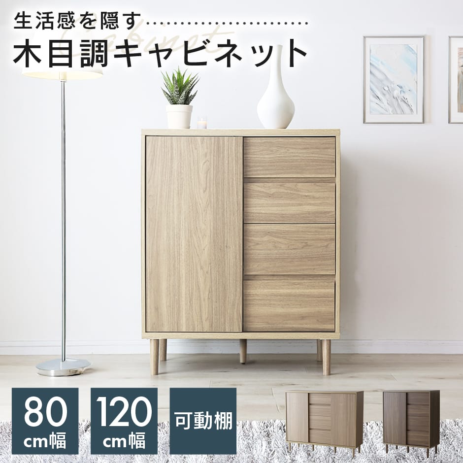 四方を囲った天然の木目とグレージュトーンの前板の組み合わせが魅力の上質なフォルム。北欧×和の美意識を纏った、暮らしを整えるサイドボードシリーズ。バイカラーが映えるジャパンディデザイン天然の木目がもたらす柔らかな風合いに、落ち着いたグレーの前板を組み合わせたバイカラーデザインが部屋のインテリアのアクセントに。北欧のナチュラルな心地よさと、日本のミニマルな美意識を融合させたジャパンディスタイルのシリーズです。使いやすさにこだわった収納設計・引き出しは高さ6cmと9cmの引出を組み合わせた4段収納で、雑誌や説明書、小物を効率よく整理可能。・フルスライドレール仕様なので奥までスムーズに引き出せ、出し入れのストレスを軽減します。長く使える安心の強度・引き出しは荷重や歪みに強いロッキング箱組を採用。底抜けや前板外れを防ぎ、長年の使用にも耐える安心の強度を実現しました。・脚部は圧迫感を与えない下駄脚デザインで、荷重に強く安定感も抜群。10cmの脚高は部屋に圧迫感を与えず、お掃除ロボットにも対応して部屋の美しさを保てるのも嬉しいポイントです。