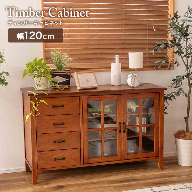 ■キャビネット 木製 ティンバー 食器棚 幅120cm ダイニング キッチン 天然木 PM-308 引き出し ガラス扉 サイドボード 完成品 3段 棚 アン