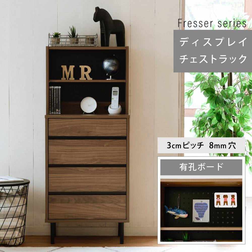落ち着いた木目調のブラウンとブラックスチールの組み合わせがモダンな印象を与える、北欧テイストシリーズ"Fresser"。4段のチェストに有孔ボード付きのラックが付いたディスプレイチェストラック。シンプルなデザインながら、飾るもので個性を演出できます。