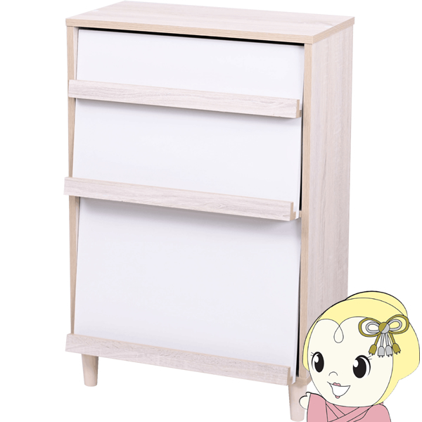 ■カラー:ナチュラル×ホワイト【NAWH】 ■サイズ [外寸]幅60×奥行35.5×高さ90(アジャスター80.5)cm [内寸] (フラップ部1段目)幅55×奥行1.5×高さ13.5cm (フラップ部2段目)幅55×奥行1.5×高さ20.5cm (フラップ部3段目)幅55×奥行1.5×高さ36.5cm (フラップ扉内1段目)幅52×奥行24.5×高さ31cm (フラップ扉内2段目)幅52×奥行24.5×高さ32cm ■素材 [本体]プリント紙化粧合板 [扉]合成樹脂化粧合板(PVC) [脚]天然木 ■耐荷重 [天板]約10kg以下 [フラップ扉1〜2段目]約1.5kg以下 [フラップ扉3段目]約2.5kg以下 [扉内固定棚]各約5kg以下 ■備考 ・背面化粧なし ・脚裏フェルト付き ・アジャスター付き ■組立時間(目安)(大人2人) お客様組立(30分) ※お客様組立て品につきましては、組み立て後に不良の連絡をされても対応ができません。 組み立て前にパーツに不良・傷等がないか、必ずご確認下さいます様よろしくお願い申し上げます。 ※記載は商品仕様の一部です。仕様説明不足等