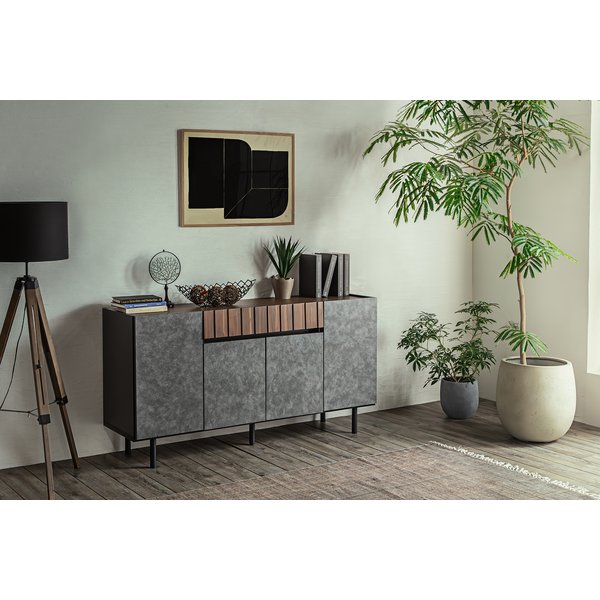 四方を囲った天然の木目とグレージュトーンの前板の組み合わせが魅力の上質なフォルム。北欧×和の美意識を纏った、暮らしを整えるサイドボードシリーズ。バイカラーが映えるジャパンディデザイン天然の木目がもたらす柔らかな風合いに、落ち着いたグレーの前板を組み合わせたバイカラーデザインが部屋のインテリアのアクセントに。北欧のナチュラルな心地よさと、日本のミニマルな美意識を融合させたジャパンディスタイルのシリーズです。使いやすさにこだわった収納設計・引き出しは高さ6cmと9cmの引出を組み合わせた4段収納で、雑誌や説明書、小物を効率よく整理可能。・フルスライドレール仕様なので奥までスムーズに引き出せ、出し入れのストレスを軽減します。長く使える安心の強度・引き出しは荷重や歪みに強いロッキング箱組を採用。底抜けや前板外れを防ぎ、長年の使用にも耐える安心の強度を実現しました。・脚部は圧迫感を与えない下駄脚デザインで、荷重に強く安定感も抜群。10cmの脚高は部屋に圧迫感を与えず、お掃除ロボットにも対応して部屋の美しさを保てるのも嬉しいポイントです。