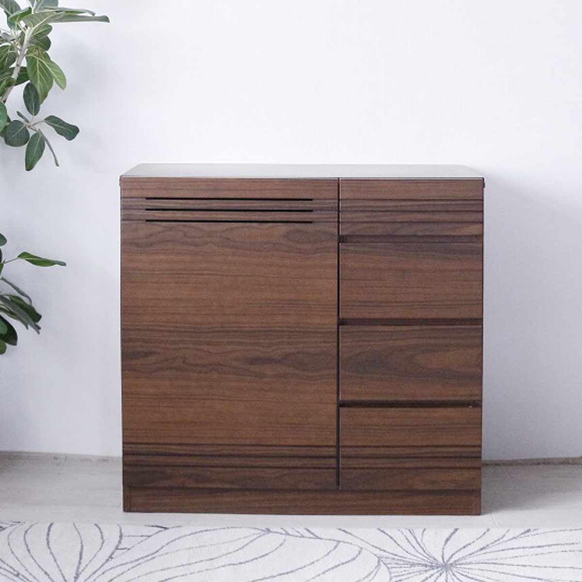 クルミ天然木の温もりとセラミック柄が織りなすモダンなたたずまい。フロート感のある洗練されたフォルムと、スリットが奏でるアーバンスタイル。■柔らかな天然木が織りなすコンテンポラリーデザイン引出しに配した細やかなスリット状にデザインした天然クルミ材。落ち着きのあるセラミック柄の天板でモダンリビング。オイル仕上げによって引き出された自然な木目は、上質な空間を演出します。■すっきりとしたデザイン台輪を後方に配置することで、軽やかな印象的なデザイン。圧迫感を感じさせない洗練された外観で、リビングに開放感をもたらします。■使いやすさを追求した収納設計3枚の扉内には可動棚板を設置し、サイズの異なる収納物にも柔軟に対応。使い勝手の良い引き出しには、小物類をすっきりと整理できます。天板は飾り棚としても活用でき、インテリアの幅が広がります。■品質へのこだわり日本の品質基準に基づいた企画で、信頼できる日系中国工場での製造。安定感のある頑丈な造りで、長くお使いいただける確かな品質を実現しています。