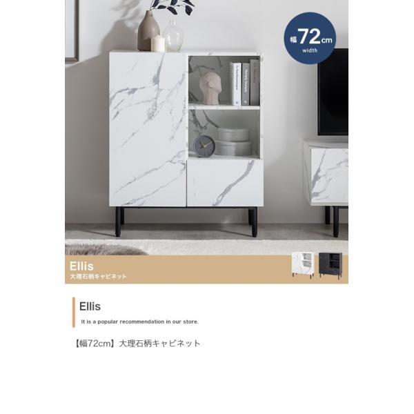 大理石柄がスタイリッシュで美しい『Ellis(エリス)』シリーズのキャビネット。どこから見ても美しいノイズレスデザインが、モダンで高級感漂う空間を演出します。用途やサイズごとに仕分けができる3種類の収納エリアを設け、本や書類、小物なども纏めて収納できます。扉収納にはコード穴が開いているので、Wi-Fiルーターなどの収納にもピッタリ。幅72cmとコンパクトなので、ワンルームなど限られたスペースにもすっきり置いていただけます。配達業者を指定いただくことはできません。沖縄・離島に関しましては、別途配送料が必要となります。北海道への配送も別途配送料が必要になる場合がございます。※別途送料が発生する場合は後ほどご連絡させていただきます。タイミングによっては在庫切れの場合があります。