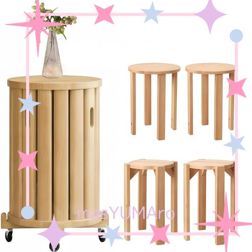 ■EASTEAMILY スツール 4脚セット スタッキングチェア キャスター付き 直径36CM×高さ54CM 無垢材 4IN1 ダイニング チェア サイドテーブル