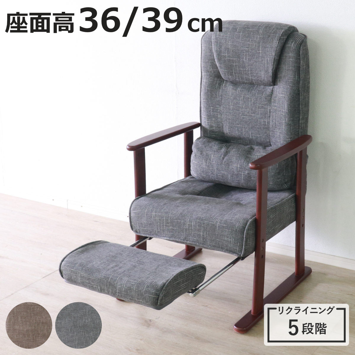 ■高座椅子 高齢者 リクライニング フットレスト 折りたたみ コンパクト リクライニングチェア 座面高36/39cm ( 高さ調節 ハイバック ロー