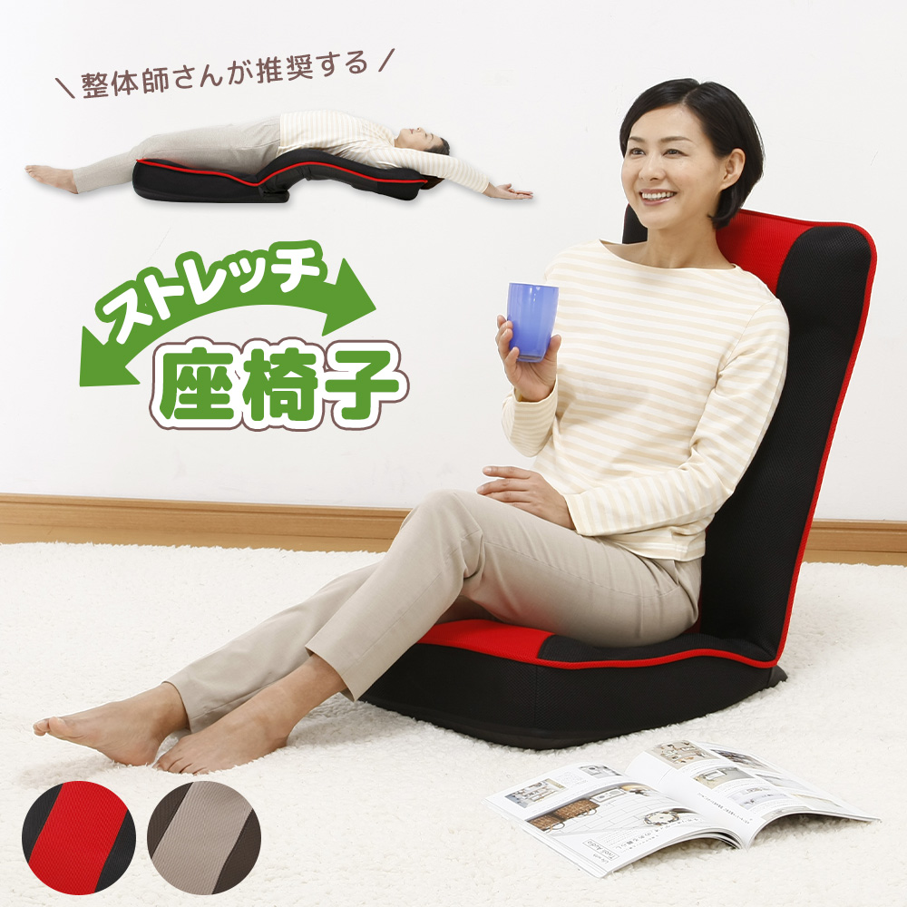 背もたれに体重を掛ければ首・背中・腰まで心地良い。 整体師さんが考案した健康ストレッチ座椅子。 頭まで支えるハイバック仕様。 背もたれのS字カーブが身体にしっかりフィットします。 ●カラー レッド ブラウン ●サイズ 約幅46×奥行64〜113×高さ15〜70cm 座面高:約12cm ●重さ 約5.8kg ●素材 [構造部材] スチールパイプ、中材:ウレタンフォーム [側生地] 表地:ポリエステル(メッシュ) 裏地:ポリエステル ●仕様 背もたれ14段階リクライニング ●備考 一部組立式 ●生産国 中国製(企画:日本) ●検索キーワード 座いす 椅子 イス ローソファ パーソナルソファ コンパクト 疲労ケア 鑑賞 休憩 疲れにくい ヒップポケット設計 猫背 反り腰 巻き肩 ギフト 父の日 母の日 敬老の日