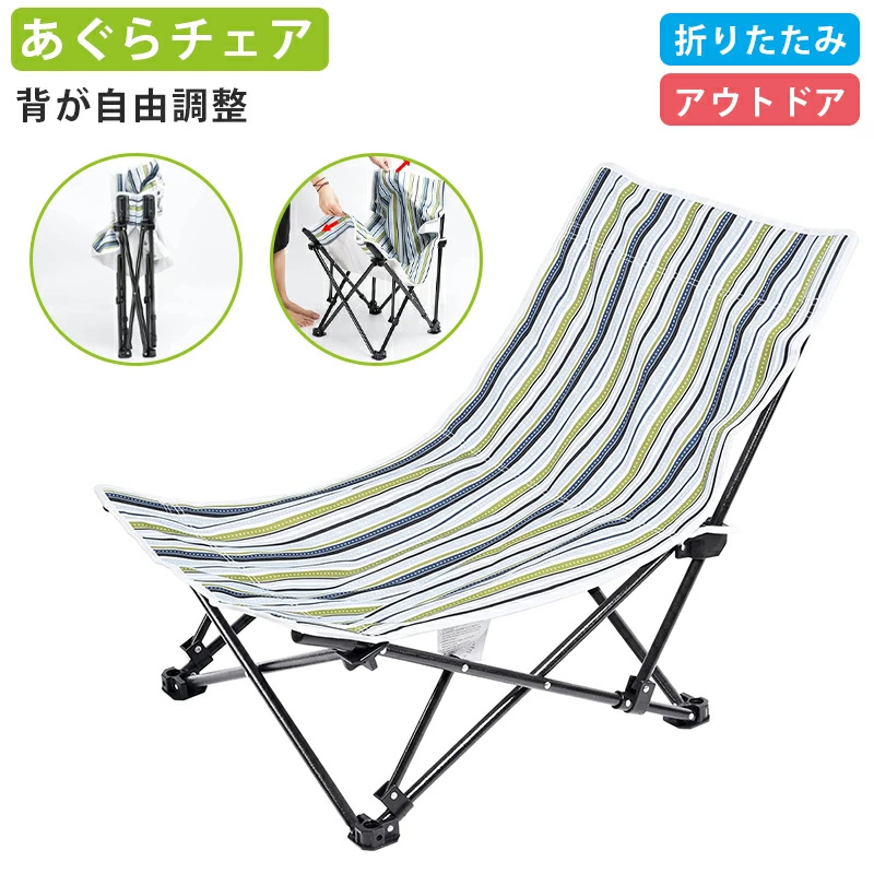 リクライニング機能 背もたれの角度を2段階調整出来るリクライニング機能が搭載されたあぐらチェアで、より楽な体勢でくつろぐ事が出来ます。 座り心地 重心が低いので安定性には優れ、ぐらつくことはありませんでした。 安定 収納バッグが付属しているため持ち運びにも便利。フレームはスチールを採用しており、耐荷重約120kgと優れた強度と安定感を有しています。 軽量 & 持ち運び 比較的軽量なので、持ち運びは問題なしといえます。折りたたむと比較的コンパクトになるため、場所を問わずどのようなスペースにもすっきりとおさめられるでしょう。 アウトドアで使用 ローチェアとは、座面の高さが26cm程度のアウトドアチェアハイバックを指します。この高さは、焚き火や囲炉裏テーブルを囲んで楽しむのにちょうどよい高さといえます。