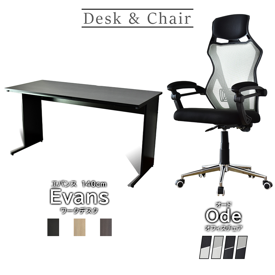 【配送につきまして】◆北海道・沖縄・離島は別途送料お見積りとなります。■商品名:エバンス140cm & オード【Evans 140 & Ode】■本体サイズ【エバンス140cm】約幅140×奥行60×高さ72(cm)【オード】約幅65×奥行66×高さ111(111〜121)×座面高45(45〜55)(cm)■梱包サイズ【エバンス140cm】約幅147×奥行65×高さ10.5(cm)【オード】約幅76×奥行25×高さ59(cm)■材質【エバンス140cm】パーティクルボード・スチールパイプ【オード】メッシュファブリック・ポリエステル・合板・金属脚・ウレタンフォーム■本体重量【エバンス140cm】約22kg【オード】約12kg■耐荷重【エバンス140cm】約50kg【オード】約90kg■総重量(梱包材含む)【エバンス140cm】約23.5kg【オード】約13.5kgご予約商品をご購入の場合、au PAYゆったり後払いはご利用になれません。他のお支払方法をご選択ください。