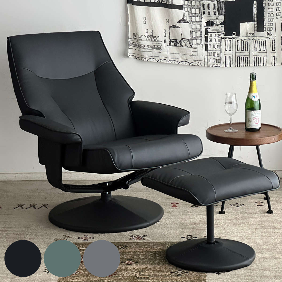 ■パーソナルチェア リクライニング オットマン付 座面高48〜52cm メソッド ( 1人掛け ソファ ハイバック チェア PVC レザー調 回転 足置