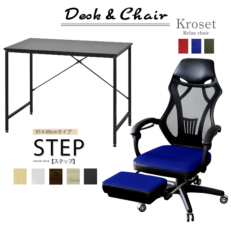 【配送につきまして】◆北海道・沖縄・離島は別途送料お見積りとなります。■商品名:ステップ95×48cm & クロセット【Step95×48cm & Kroset】■本体サイズ【ステップ95×48cm(デスク)】幅95×奥行48×高さ74(cm)【クロセット(オフィスチェア)】幅70×奥行70×高さ111〜121×座面高42〜52(cm)※個体差により若干の差異あり■梱包サイズ【ステップ95×48cm(デスク)】約幅98×奥行50×高さ7(cm)【クロセット(オフィスチェア)】約幅80×27×64(cm)■材質【ステップ95×48cm(デスク)】合成樹脂化粧パーティクルボード(メラミン加工)【クロセット(オフィスチェア)】メッシュ・PVC・ポリプロピレン・ナイロン・ウレタンフォーム■本体重量【ステップ95×48cm(デスク)】約7.5kg【クロセット(オフィスチェア)】約13kg■耐荷重【ステップ95×48cm(デスク)】40kg【クロセット(オフィスチェア)】90kg