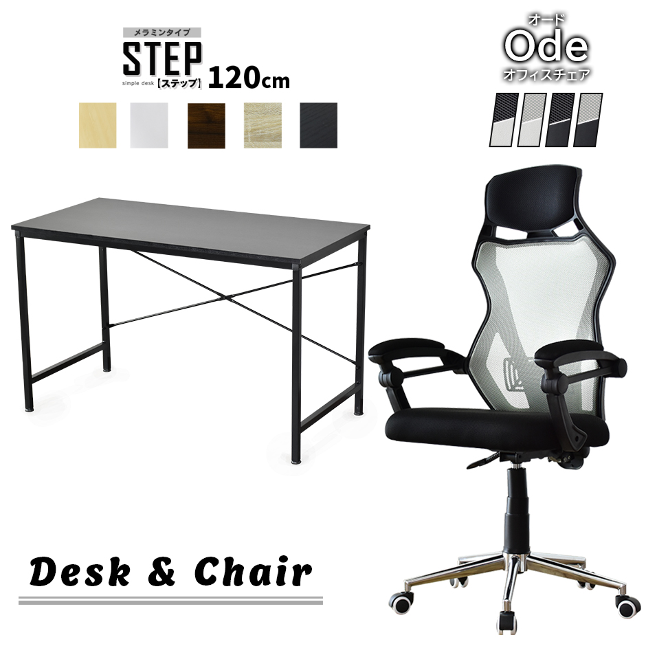 【配送につきまして】◆北海道・沖縄・離島は別途送料お見積りとなります。■商品名:ステップ120×60cm & オード【Step120×60cm & Ode】■本体サイズ【ステップ120×60cm(デスク)】幅120×奥行60×高さ74(cm)【オード(オフィスチェア)】幅65×奥行66×高さ111〜121×座面高45〜55(cm)※個体差により若干の差異あり■梱包サイズ【ステップ120×60cm(デスク)】約幅123×奥行61.5×高さ9(cm)【オード(オフィスチェア)】約幅76×奥行25×高さ59(cm)■材質【ステップ120×60cm(デスク)】合成樹脂化粧パーティクルボード(メラミン加工)【オード(オフィスチェア)】メッシュファブリック・ポリエステル・合板・金属脚・ウレタンフォーム■本体重量【ステップ120×60cm(デスク)】約15.5kg【オード(オフィスチェア)】約12kg■耐荷重【ステップ120×60cm(デスク)】40kg【オード(オフィスチェア)】90kg