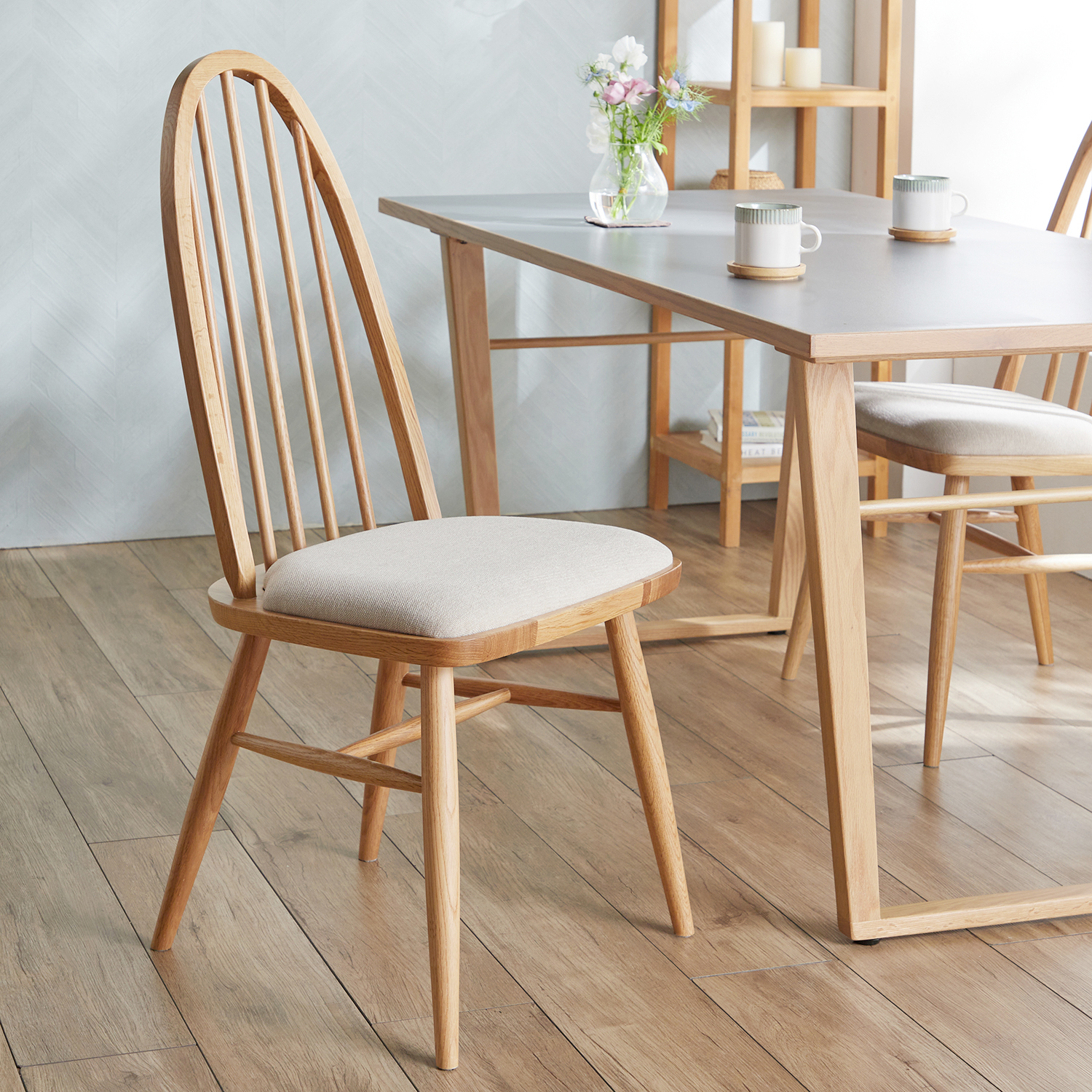 木目の美しい天然木オーク材を使用したダイニングチェアですハイバックタイプの背もたれは体のラインに合うよう、なだらかなカーブをもたせているから当たりも優しく、背中をゆったりと預けられるのがGOOD座面はアイボリー、ブラウンの「ファブリック」と、木目が際立つの「板座」の3タイプをご用意しました同ブランドのダイニングテーブルと合わせると、明るい北欧テイストのダイニングに「nofflys」シリーズでのお部屋コーディネートがおすすめ