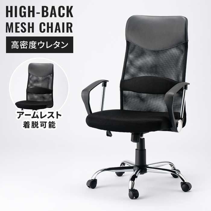 頭までしっかりサポートしてくれるハイバック仕様のデスクチェア。ロッキング機能(最大20度)を使えば体全体を伸ばしてリラックスできます。背もたれの滑らかなS字デザインと、お好みの位置に調整できる腰当てランバーサポートによりデスクワークでの体への負担を軽減。メッシュの2層構造で湿気を逃し、蒸れずにサラサラ、弾力性・安定感・サポート力が違います。座面には高密度ウレタンに加え、チップウレタンを追加し、抜群の耐久性と座り心地を実現。座面下のレバーで簡単にお好みの高さに調整できます。高級感のあるメッキ脚にキャスターがついており、360度回転し、座ったまま移動もラクラク。肘(アームレスト)は付け外しが可能可能です。