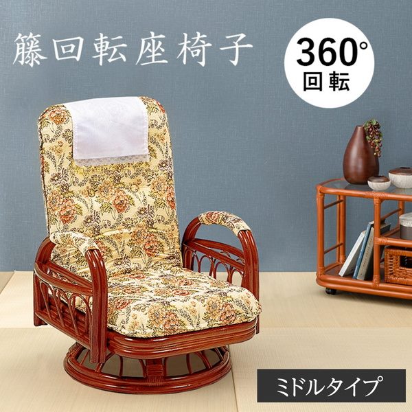 ■回転座椅子 高座椅子 肘掛け付き ハイバック ミドルタイプ おしゃれ 籐 ラタン製 高齢者 3段階リクライニング 360度回転