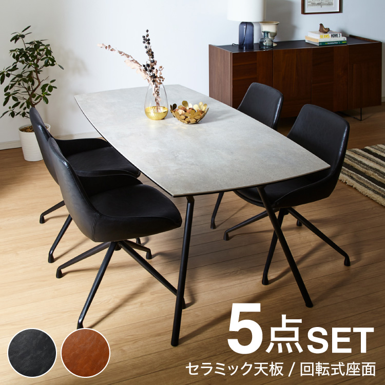 ■テーブル【商品説明】セラミック天板とスチール脚を組み合わせたスタイリッシュなダイニングテーブル。セラミックなのてキズや熱に強く丈夫です。【サイズ】幅170×奥行80×高さ72cm【材質】天板:セラミック天板13mm(セラミック5mm、強化ガラス8mm)脚部:スチール(粉体塗装)【生産国】中国【製品重量】約56kg【天板耐荷重】約30kg【備考】耐熱性:130度防水性:吸水率 0.075組立:スチール脚取付けのみ■チェア(4脚)【商品説明】回転式の座面で、テーブルの出入りがスムーズにできます。肘なしの設計でテーブルに収まりやすいのもポイント。心地良いフィット感と程よいクッション性で、快適な座り心地が体感できます。【サイズ】幅52×奥行58×高さ78cm座面高43cm【材質】張地:PUレザー芯材:積層合板中身:ウレタンフォーム脚部:スチール(粉体塗装)【生産国】中国【製品重量】7kg【座面耐荷重】80kg【備考】組立品