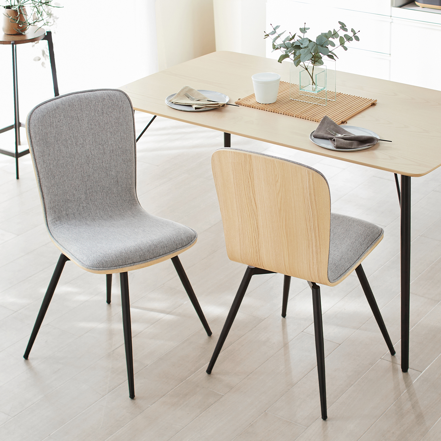 背もたれと座面を一体化させたデザインと背面の木目シートが印象的なチェア2脚セット背面から見てもスタイリッシュな佇まいブラックカラーの細身のスチール脚でスッキリとした印象に座面が回転するので椅子を大きく引かずに立ち座りができますシリーズのダイニングテーブルと揃えて、統一感のある空間を演出するのもオススメです