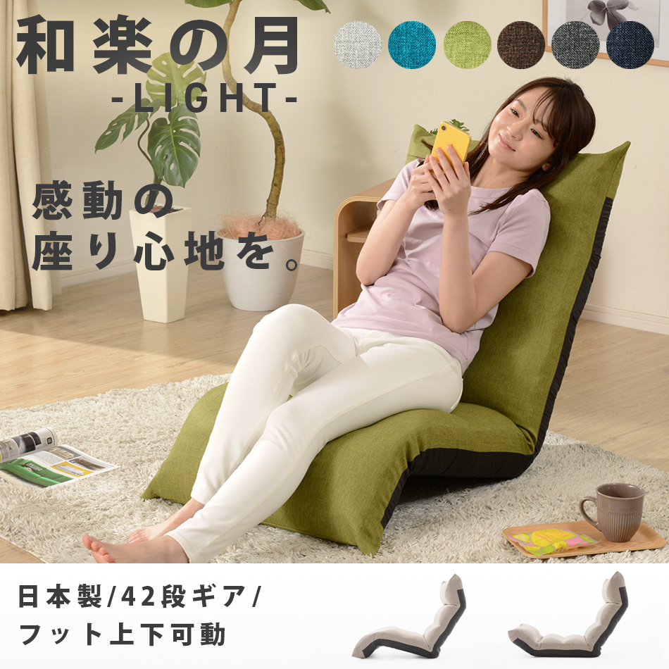 『感動の座り心を。』安心の日本製リクライニング座椅子!6色から選べるフット部は上下可動のギアを採用!フット・背面・ヘッドの3ヶ所リクライニング搭載で満足。【商品名】 42段リクライニング座椅子 「和楽の月-Light-」【素材】表地:表地:ポリエステル100%裏地:ポリエステル100%、発泡ウレタン、チップウレタン、綿、金属フレーム【サイズ】W550×D870〜1390×H155〜740mm【機能】転倒防止付きヘッド14段 背42段 フット11段リクライニング【製造国】日本製【重量】8kg※沖縄・離島へは配送を行っておりません。ご注文いただいた場合、勝手ながらキャンセルとさせていただきます。 ※和楽の月と違って生地の張りが流線型で、スタイリッシュな形です。 ※サイズは和楽の月より若干大きいです。