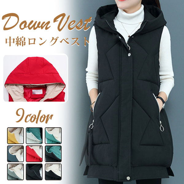 ■セール中 中綿入り ロングベスト 中綿コート レディース 無地 ダウンベスト 前開き ジャケット ジレ ノースリーブ 羽織り 軽量 アウター