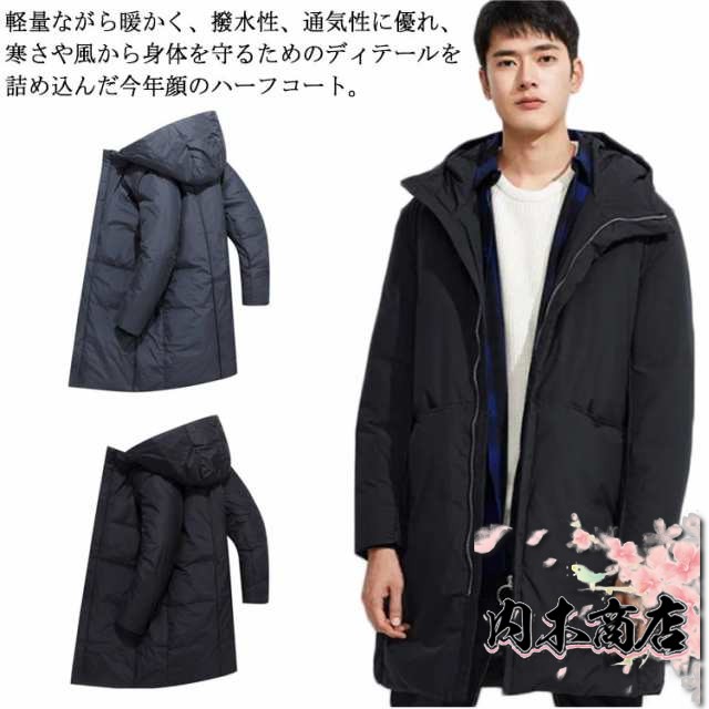 エコダウンコート メンズ ハーフコート ダウンジャケット スリム ビジネスコート フード付き スタンドカラー 厚手 撥水 軽量 通勤 通学 秋冬 保温 防寒 防風 細身 大きいサイズ グレー 黒 ブラック 無地 シンプル