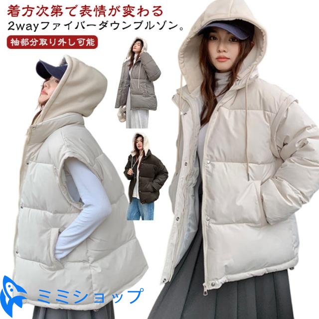 袖取り外し アウター 中綿ジャケット 2WAY レディース 中綿ベスト 中綿 オーバーサイズ フード付き スタンドカラーコート ダウンジャケット コート ダウンコート 秋 ファイバーダウン 袖取り外し 体型カバー 防寒 防風 暖かい