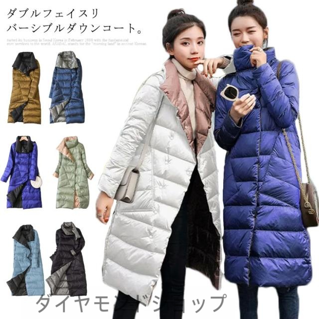 ダウンコート リバーシブル 両面 ロングコート レディース ライトダウン アウター 軽量 大きいサイズ ダウン90% ダウンジャケット 配色 防寒 スタンドカラー 冬服