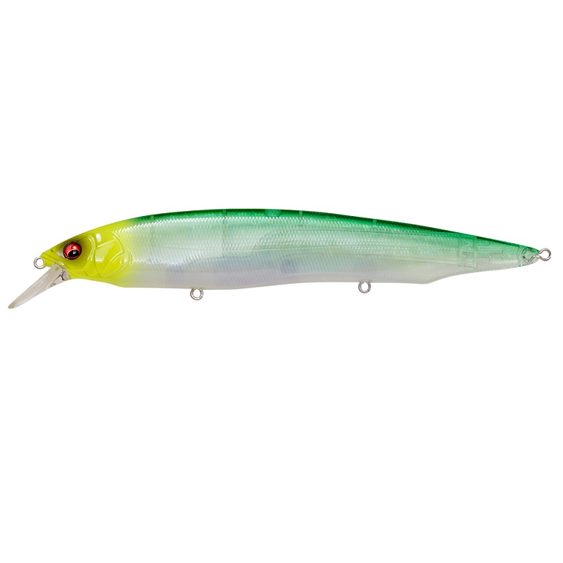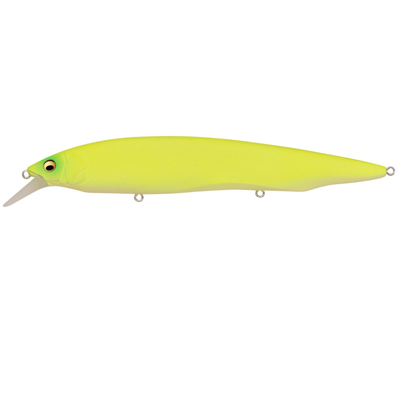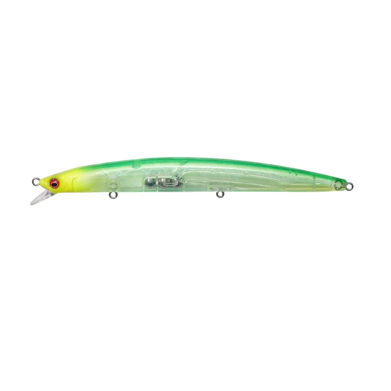 カナタSWは大型のベイトを捕食しているターゲットに絶大な効果を発揮するハイ・インパクトジャークベイトです。体高のある160mmのシルエットはインパクト抜群。なのに、引き抵抗は極めて軽く、テンポよくエリアをサーチするレスポンシビリティを兼備。ストレートリトリーブでは、強烈な明滅を伴うハイピッチ・ロールアクションでターゲットに強烈にアピール。なお、極限までシェイプアップしたスリムなフラットサイドフォーマットと、内蔵された「超高比重タングステン・トリプルオシレートシステム」は、逆風をものともしない圧巻のスーパーロングキャストを実現。スプーキーなモンスターフィッシュから警戒されない的確なロングディスタンス・アプローチを可能としています。スレンダーなカナタの魅力は、その超薄型ボディのみが放つ妖艶なナチュラリズム。従来のミノーには反応しなかったクレバーなビッグサイズが襲撃してくることです。