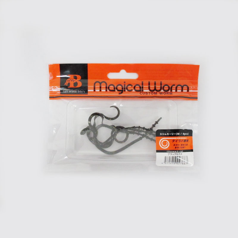 釣り人×マジカルシリーズ=釣果(実釣時間)UP!マジカルワーム繊細な動きから生まれる波動マジック+集魚力マジカルワームはシリコンゴムネクタイの動きに着目、今までのワーム素材に無いより薄く鋭いピンテールが集魚効果をアップ。ワームボディはテールの動きを妨げない形状で使用するヘッド、スカートにアジャストできるロングボディデザイン。度重なるプロトタイプのテスト釣行において、遊漁船船長も絶賛の好釣果を実現。ハイシーズンでは大幅にバイト率がアップ、特に厳しいシーズン初期、終期の状況では、周囲を上回る釣果実績を出しました。SALTWATERBOYS Magical Wormソルトウォーターボーイズ マジカルワーム●タイプ:スリムカーリー●サイズ:M●カラー:ブラックゴールドラメ●入数:4本入り