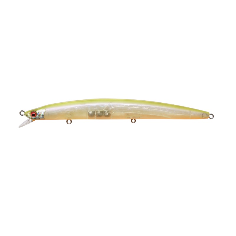 最大の特徴はスリムでロングレングスのストレートシェイプ。全長16インチ(約40cm)という他に類を見ないサイズ設定は繊細さとアピール力を具現化したもの。ハイプレッシャーな状況において、このルアーパワーは大きなアドバンテージになります。
