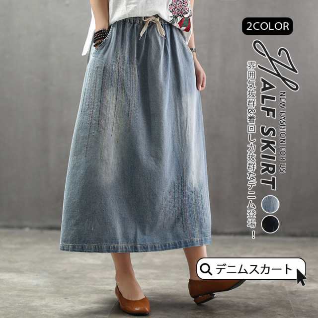 ■【ポイント10倍!】 デニム スカート レディース ロング ヴィンテージ加工 ユーズド感 ブリーチ 着痩せ 可愛い ゆったり 大きいサイズ A