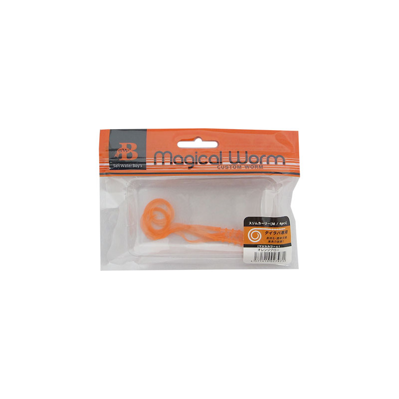 釣り人×マジカルシリーズ=釣果(実釣時間)UP!マジカルワーム繊細な動きから生まれる波動マジック+集魚力マジカルワームはシリコンゴムネクタイの動きに着目、今までのワーム素材に無いより薄く鋭いピンテールが集魚効果をアップ。ワームボディはテールの動きを妨げない形状で使用するヘッド、スカートにアジャストできるロングボディデザイン。度重なるプロトタイプのテスト釣行において、遊漁船船長も絶賛の好釣果を実現。ハイシーズンでは大幅にバイト率がアップ、特に厳しいシーズン初期、終期の状況では、周囲を上回る釣果実績を出しました。SALTWATERBOYS Magical Wormソルトウォーターボーイズ マジカルワーム●タイプ:スリムカーリー●サイズ:M●カラー:オレンジグロー●入数:4本入り