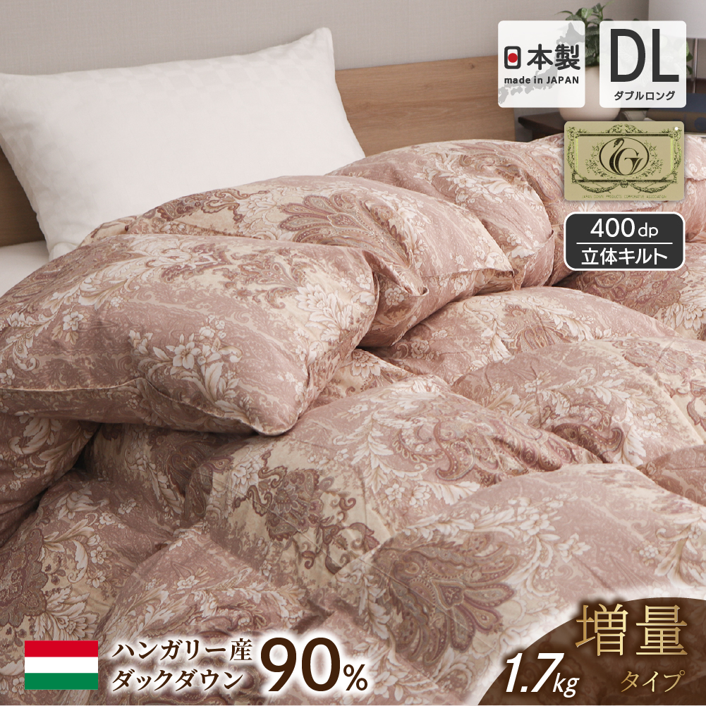 【サイズ】ダブルロングサイズ 190×210cm【側生地】ポリエステル100%【詰め物】ハンガリー産ホワイトダックダウン90%、フェザー10%(ダウンパワー400dp以上、ロイヤルゴールドラベル)【詰め物の充填量】1.7kg【仕立て】立体キルト【生産国】日本【お取り扱いについて】ご家庭でのお洗濯不可(専門のクリーニング業者などにご相談をおすすめします)【その他仕様】ダウンプルーフ加工・8か所ひも通し付き・収納ケース付・羽毛増量タイプ【商品説明】ハンガリー産ホワイトダック90%の羽毛を1.7kg充填した増量タイプの羽毛布団です。夏は暑く冬は厳しい寒さが特徴のヨーロッパの大陸性気候の影響を受けるハンガリーの、豊かな自然の中で育ったダックの羽毛を使用。厳しい寒さに耐え、広々とした農場で飼育された水鳥は、ダウンボールが大きく保温性の高いダウンを持っており、さらに、そのダウンを一般的な羽毛布団の充填量よりも多い1.7kgも充填し、非常にボリューム感があるお布団に仕上げました。お布団1枚でも十分暖かな羽毛布団をお探しの方にお勧めいたします。