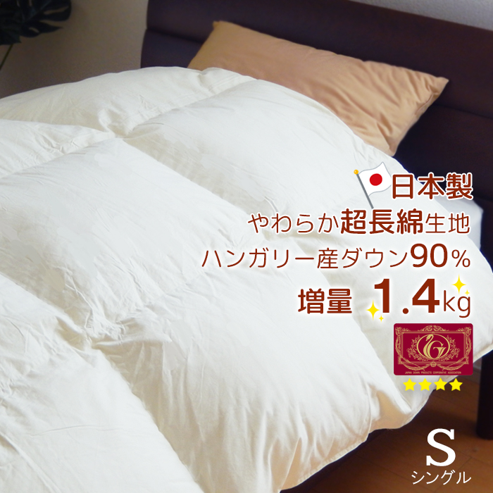 ■日本製 羽毛布団 シングル 増量1.4kg ハンガリー産ダウン90% 超長綿やわらかい側生地 ロイヤルゴールドラベル 抗菌 防臭