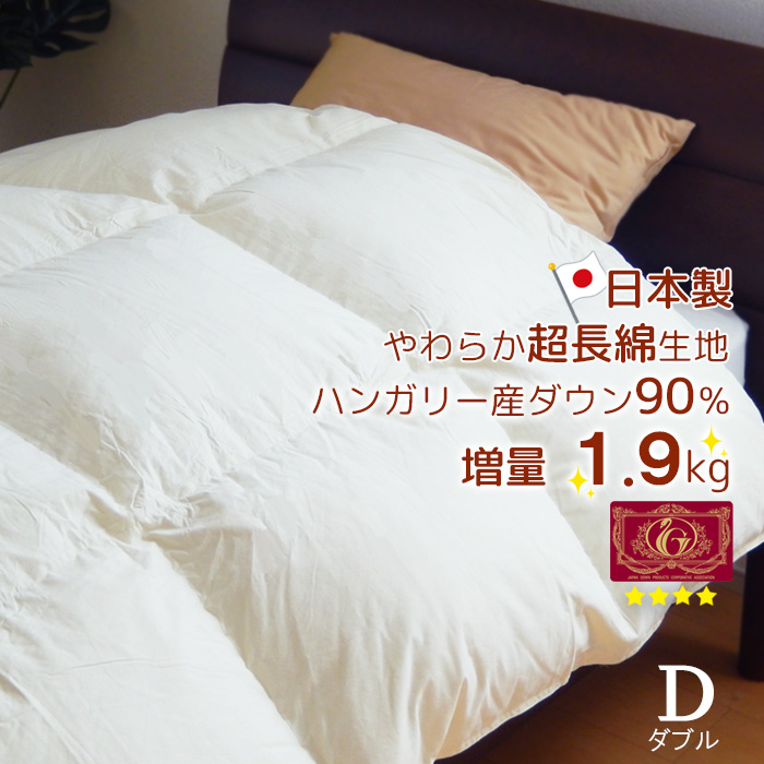 ■日本製 羽毛布団 ダブル 増量1.9kg ハンガリー産ダウン90% 超長綿やわらかい側生地 ロイヤルゴールドラベル 抗菌 防臭