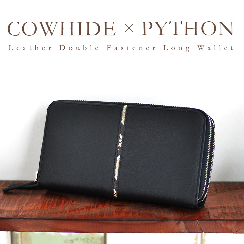 ■蛇革 財布 牛革 × パイソン レザー ダブルファスナー 長財布 ラウンドファスナー式 メンズ レディー 送料無料