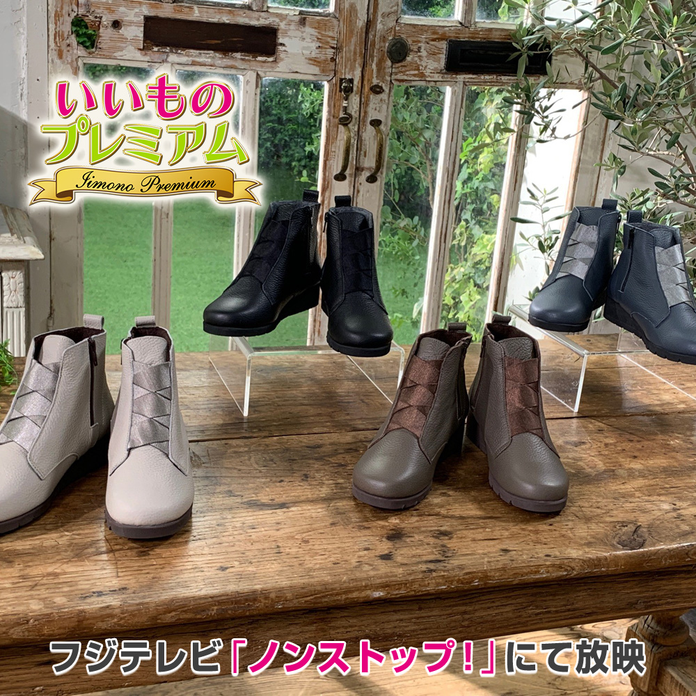 フジテレビ『いいものプレミアム』で放送10/28放送時【1,000足以上】販売!ただ今大ヒット中『フィグリーノ』ファン必見!新作登場!牛革なのに驚くほど柔らかいブーツ!脚長に見えるウェッジソールモデルが登場!履き心地◎で人気のフィグリーノに秋の新作登場!暖かなブーツはおしゃれに履きたいですね。でもブーツって、意外に履きづらい…。特に牛革は、重くて疲れるし、締めつけられて窮屈。そこでご紹介したいのが『フィグリーノ ウェッジソールレザーブーツ』。牛革なのに、軽く、やわらかく、まるでスニーカーのような履き心地。おしゃれなのにカッチリし過ぎないからカジュアルにも合わせやすく、毎日活躍します。さらに『もう少しヒールがほしい』というお客様の声にお応えして、3.5cmのウェッジソールモデルになりました!◎カラーは、ブラック、オフベージュ、オリーブブラウン、ブルーグレーの4色をご用意!『フィグリーノ ウェッジソールレザーブーツ』のポイントは3つ(1)とにかく履き心地がいい!(2)疲れにくい!(3)さまざまなファッションに似合う!【こだわりの牛革】◎「牛革なのに履き心地がいい!」その秘密は牛革に…。高い技術を持つ兵庫県たつの市のタンナーがフィグリーノのために独自開発した日本製の牛革を使用。しっかりとした強度を保ちながら、やわらかく、しなやかで、心地よく足にフィット。足の指が自由に動くほどラクチンです。◎通常より多い18工程かけてやわらかく!通常の革は完成までに12工程。ところが今回の牛革はなんと18工程もかけました。職人が1枚1枚、丁寧に伸ばして、揉んで、手間暇かけることで、ここまで軽く、やわらかく、しなやかに仕上がりました。【靴づくりも丁寧な手作業で!】◎大量生産できないこだわりの作りやわらかな牛革を靴に仕立てたのは神戸の熟練の靴職人。手作業で1足1足、丁寧に作っているため、締めつけ感の少ない、包み込まれるような履き心地。大量生産ができないので、売り切れることも多くお早めに。★〈軽い〉牛革なのに、重さは片足たった約240g(23cm)!重たいブーツだと片足500g以上あるものもあり、この軽さは本当に嬉しい!★〈足にフィット〉革のブーツは馴染むまでに時間がかかるのが悩みですが、これなら届いた日から足にフィット。ブーツが足に合わせてくれる感覚です。★〈甲高・幅広・外反母趾の方にも〉革がやわらかいから、お悩み足にはもちろん、硬いレザーブーツで靴ずれをしたことのある方にもおすすめです。★〈ゴム仕様〉靴ヒモ部分がゴム仕様なのもラクチン!締め付け感が少なく、快適なんです。★〈サイドファスナー付き〉ファスナー付きだから脱ぎ履きスムーズ。★今年から嬉しいウェッジソールタイプに!3.5cmのソールが脚長に見せてくれます。「疲れにくい!」のもフィグリーノの魅力!履いて、歩くと、衝撃を感じさせず、歩行がスムーズ。弾力のあるソールで、1日中履いていても疲れにくい!こんなに気持ちよく履けるブーツは、見つけにくいですよ。★〈インソール〉体重のかかる中敷きには高反発素材を採用。着地の衝撃を吸収して軽減します。★〈靴底〉靴底がやわらかく、屈曲性が良いのも疲れにくい理由。スリットが入ったソールを使用することで、自由自在に曲がり、足の動きにフィット。ムダな力が入らず、疲れにくいんです。カッチリし過ぎず、カジュアルでもおしゃれ!牛革ならではのきちんと感があるから、カジュアルからエレガントまで大人の女性にピッタリ!エレガントなワンピースやワイドパンツから普段のデニムまで、お手持ちの洋服に合わせやすい。★〈内側フリースであったか!〉寒い時期に履くブーツだけに、内側にぐるりとフリース素材を使用。中敷までリース素材なので暖かいんです。