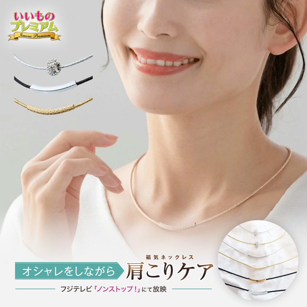 オシャレしながら、首や肩のコリをケアアクセサリー感覚で毎日着けられるジュエリーメーカーの磁気ネックレス普通のネックレスに見えて・・・実は首や肩のコリを改善する "磁気ネックレス" なんです!作ったのはジュエリーメーカー!だから磁気ネックレスに見えないくらいオシャレ!これだけオシャレでも実力はスゴイ!管理医療機器認証を取得。装着部位のコリおよび血行を改善する効果があるんです。普段からアクセサリ-感覚で着用可能!磁気ネックレスに見えない程オシャレだから、お洋服を選ばず毎日着けられちゃいます♪ワンピースなどにもマッチするデザインでお出かけ時も周囲に気づかれず、オシャレをしながら肩こりケアできます。ネックレスの内側には、ぐるっと一周最大160m Tのネオジウム磁石を136個びっしり配置!クリップがびっしり付くほど磁石のパワーがものすごい!強力な磁石がぐるっと一周配置されているから、クリップがびっしり付くんです!※磁石の強度実験(本品そのものではありません)※販売商品とは色が異なります360°首〜肩まわりに一気にアプローチ!小さいのに強力な磁石と言われるネオジム磁石を採用。磁石の力でピタッ!!磁石だから着けはずしも簡単!面倒な留め具がないから誰でも簡単に装着可能!ネックレスの端を10cm程度重ねるだけで、磁石がくっつき簡単に留まります。だから、留めるのも外すのも自分で簡単に行えます。 ※販売商品とは色が異なります着け替え自由なペンダントヘッドペンダントヘッドを外せば、チョーカーのようにも使用でき、自分のお好みのペンダントヘッドに着け替えれば、さらに自由にファッションを楽しめます。外す際は、端から剥がすように取り外してください。※本体長さ:約55cm(装着時最長45cm)本体直径:約0.23cm※左右に引っ張ると破損の恐れがあります。