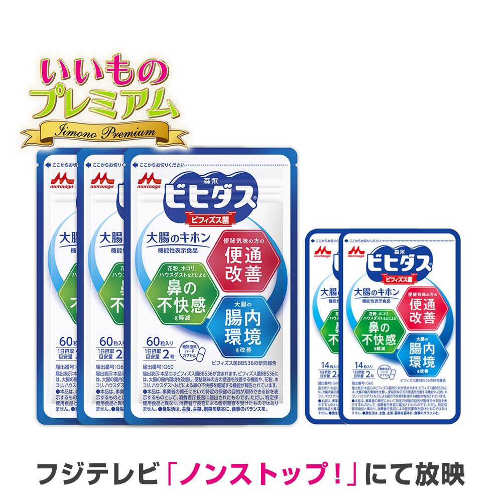 フジテレビ『いいものプレミアム』で放送便秘気味の方の便通を改善!森永ビヒダス 機能性表示食品なぜ腸内環境が重要?腸は免疫細胞の60%以上が存在する、人体で最大の「免疫機関」。中でも、全身の健康リスクが集中しているとも言われる、"大腸"の腸内環境を整えることが重要です。腸内細菌で有名な「善玉菌」「悪玉菌」ですが、善玉菌が減り、悪玉菌が増えると、腸内環境のバランスが崩れてしまいます。善玉菌を優勢に保ち続けることが大切です。 大腸にオススメなのが 【ビフィズス菌】実は大腸に棲む乳酸菌とビフィズス菌では、99.9%がビフィズス菌※!どちらも「善玉菌」と呼ばれる重要な菌ですが、大腸の腸内環境を整えるには「ビフィズス菌」なんです。※Ogata et al.,Microbial Ecology in Health and Disease.1999から算出 乳酸菌を旧Lactobacillus属とした場合しかし!ビフィズス菌は減少してしまう大腸にとって重要なビフィズス菌ですが、不規則な生活やストレス、年齢とともに減少してしまいます。赤ちゃんと比べると、50代では約10分の1に。※辨野 義巳「SUPERサイエンス 腸内細菌の驚愕パワーとしくみ」 2016年 シーアンドアール研究所より作図 「大腸のキホン」なら生きたまま腸までビフィズス菌を届けますカプセルの中にパウダーが入った構造で、パウダーの中にビフィズス菌を含有。胃の中で表面のカプセルが溶けて、中身は守られたまま腸へ!腸に届くと中のパウダーが崩れて、ビフィズス菌が放出される仕組みなんです。これは「GFRパウダー」という、森永乳業独自の技術!ビフィズス菌の量がスゴイ!1日摂取目安量 2粒で、約150億個のビフィズス菌を配合!小さい粒に設計しているので、シニアの方も飲みやすいです。【機能1】便秘気味の方の便通を改善ビフィズス菌BB536の研究レビューでは、2週間飲み続けた評価で、飲んだ方は飲まない方より排便回数が増えたということが報告されています。【機能2】花粉、ホコリ、ハウスダスト による鼻の不快感を軽減ビフィズス菌BB536の研究レビューでは、飲み続けた評価で、7週目で鼻の不快感が軽減したということが報告されています。ビフィズス菌市場 国内メーカーシェアNo.1※森永乳業はビフィズス菌のトップランナーとして長年にわたり研究を続け、ビフィズス菌・乳酸菌のメーカーシェアNo.1を誇ります。 ※ビフィズス菌市場における2024年のメーカー出荷量※(株)富士経済「機能性成分・素材市場の現状と将来展望2025」ビフィズス菌カテゴリー2024年実績ヨーグルトでお馴染み!ビヒダスシリーズ
