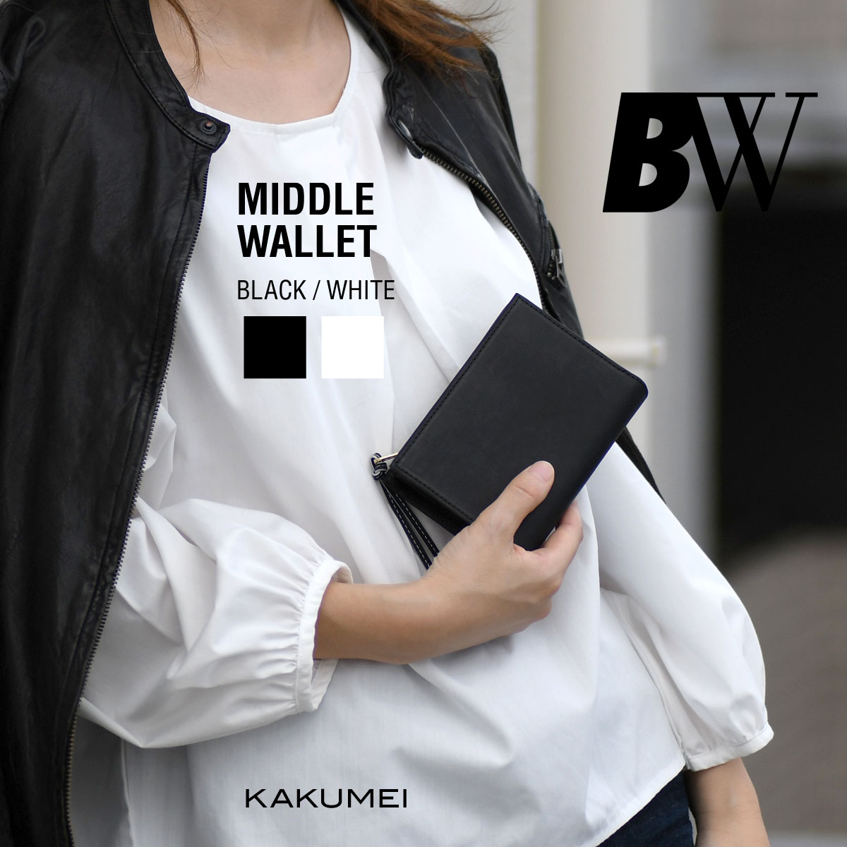■ミドルウォレット 二つ折り財布 縦型 イタリアンレザー 本革 財布 レディース KAKUMEI BW カクメイ 白黒 ブラック ホワイト 本革財布 レ