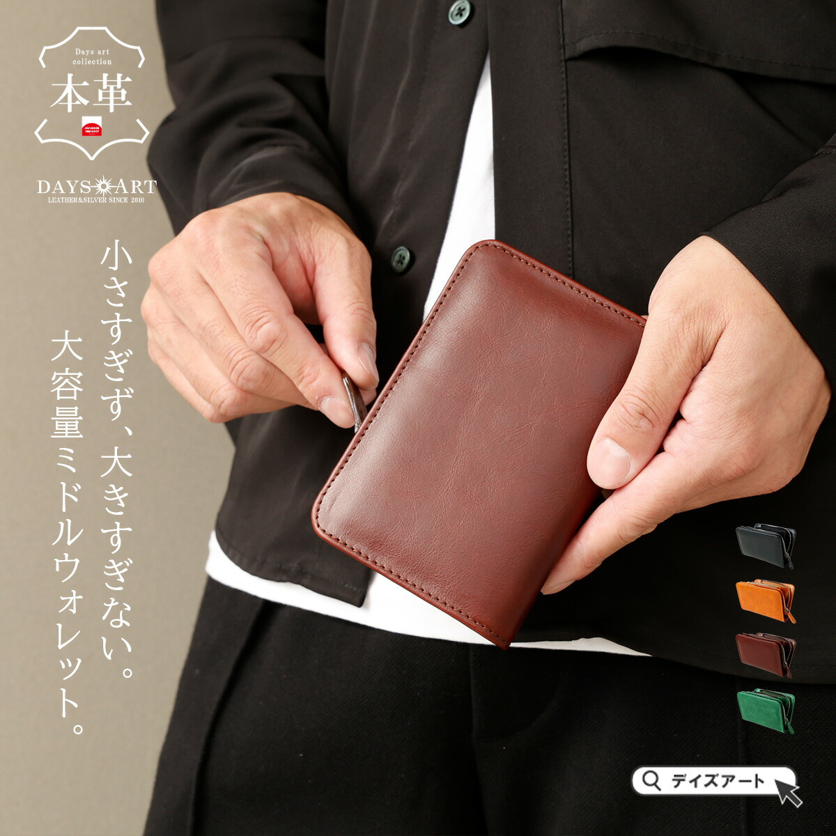 【サイズ】横幅:約13cm高さ:約8.5cm厚さ:約2.5cm重さ:約90グラム【素材】バロンレザー(本牛革)収納小銭入れ×1/カード入れ×8/お札入れ×2/マルチポケット×4【商品説明】長財布のような収納力と、ミニ財布のような携帯性を両立。DAYSART(デイズアート)の本革ミドルウォレットは、「ちょうどいいサイズ感」にこだわった万能財布です。小さなバッグにもすっきり収まり、持ち歩きやすさと使いやすさを兼ね備えています。【ご注意】※天然素材を使用しておりますので、革本来のキズや痕、シワなどがある場合がございますが、使用していくうちに馴染んで目立たなくなっていきます。革の個性としてお楽しみください。※掲載画像はできる限り加工等はせずにそのままの状態の写真を使用しておりますが、撮影環境、光の当たり具合やモニターによって若干色合いのイメージが異なることがございますのでご了承ください。※サイズは外寸となります。素材や商品の形状によっては計測位置によって誤差が生じます。※革の裏面は部位によって染色によるムラが生じている場合がございます。