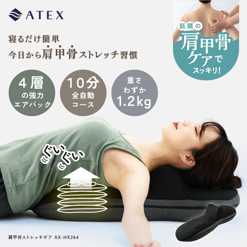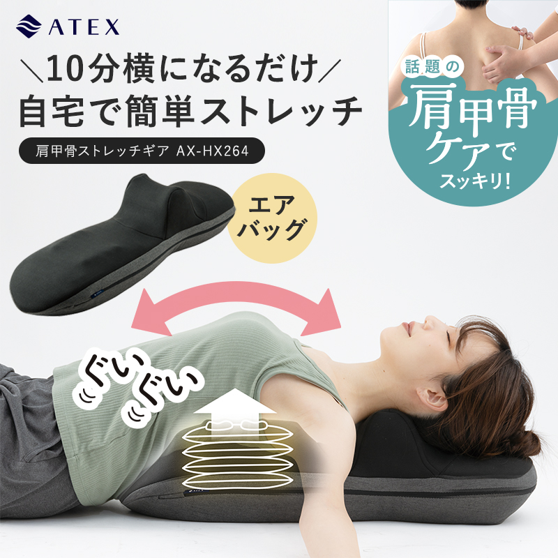フジテレビ『いいものプレミアム』で放送11/21放送時【1,000台以上】販売!ただ今大ヒット中寝るだけでスタイルアップが目指せる!固まった肩甲骨まわりの筋肉を刺激しながら、エアーバッグで上半身をまとめて効率的にストレッチ!寝るだけ!姿勢を整えスタイルアップに導いてくれる最近スタイルが悪くなったとお悩みのあなた。それ、姿勢が乱れているせいかもしれません。意識しても良い姿勢をキープするのは結構難しい。 そんな時おすすめなのが『肩甲骨ストレッチギア』このアイテムの上に寝て、カラダをゆだねていれば上半身をしっかりストレッチして美しい姿勢にスタイルアップしてくれます。縮こまってたるんだ胸やお腹をグーンと伸ばしてくれる!背筋が丸くなると巻き肩になって胸が下に下がり、骨盤が後傾してお腹がポッコリ出てしまう残念なスタイルに。。肩甲骨ストレッチギアは内蔵されたエアーバッグがグーンと膨らみ、背中の中心付近を持ち上げることで縮こまった胸を大きく開きながら、お腹の前の筋肉をしっかり伸ばします。姿勢が整うことで、残念なポッコリお腹もスタイルアップ! ※エアーバッグのレベルは強弱2段階さらに、カラダをねじって脇腹の腹斜筋もしっかりストレッチ!お腹回りの印象を左右するのが、お腹の脇にある腹斜筋。お腹を広く覆っていて、コルセットのような役割の腹斜筋をじっくり伸ばしていくことで、よりお腹がスッキリ見える良い姿勢を目指しやすくなるんです。寒くなってきた今こそ要注意!寒さで体が固まると姿勢が悪くなりスタイルダウンしやすいこの時期は寒さで筋肉がこわばりやすく、中でも見落とされがちなのが背中の筋肉。胸を張ったり、背筋を真っすぐ伸ばすためには背中の筋肉の動きを良くしてあげることがカギ!先端の突起で背中の筋肉をグイグイ刺激しながらストレッチ!だから効率的ガチガチに固まっている筋肉はただ伸ばすよりも、別の刺激を加えながらストレッチするのが効果的!『肩甲骨ストレッチギア』はエアーバッグの先端についた8つ(片側4つ)の突起が筋肉をグイグイ刺激。肩甲骨まわりや背筋を支える脊柱起立筋を刺激することで、上半身全体のストレッチの効率アップが出来ちゃう。ここがスゴイ!