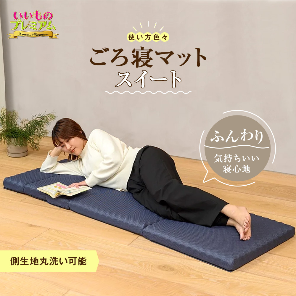フジテレビ系『いいものショッピング』で放送リビングでのお昼寝やゴロゴロ時間が超快適に!!用途に併せて使い方もいろいろ!老舗寝具メーカー西川が本気で作った『ごろ寝マット』『西川 ごろ寝マット スイート』はどこがスゴイの?◎リビングでのお昼寝やゴロゴロ時間が超快適になる◎老舗寝具メーカー西川ならではの寝心地の良さ!◎用途に合わせて使い方がたくさん!リビングでのお昼寝やゴロゴロ時間が超快適になるソファーや絨毯で昼寝して起きたら腰や肩が痛かった…リビングでゴロゴロしてくつろぎたいけどソファーは家族が使っていて場所がない…でもフローリングや絨毯の上に直に横になると床の硬さを感じてあまりリラックスできない…そんなお悩みを解決するために寝具の老舗西川がベッドマットレスで培ったノウハウを活かして開発!一般的なシングルサイズのマットレスよりもひと回り小さくてちょっとゴロゴロするのにぴったりです。高級寝具メーカー西川ならではの寝心地の良さ!ごろ寝マットだからと言って侮るなかれ!寝心地は老舗寝具メーカー西川ならではのクオリティ!≪寝心地の良さのヒミツ≫(1)中芯には、西川で実際に2万円以上で販売しているマットレスと同じ高反発ウレタン素材を特別に採用!だから薄くても体をしっかりと支えてくれ、さらに床の硬さもほとんど感じません。(2)ただ硬いだけじゃなくて、寝心地はふんわり気持ちいい!ウレタンの表面には波形の凹凸にしたプロファイル加工を採用。フラットの面に比べて、波形だと支える時に強弱ができて、ふんわり感を生んでくれます。だから寝心地もめちゃくちゃ良いんです!用途に合わせて使い方がたくさん!◆そのままお子様のお昼寝やストレッチ・ヨガのシーンにも◎◆頭側を折り畳んで「まくら」や、うつ伏せで読書や携帯をイジるときの「肘置き」も作れちゃう!◆壁際に折り畳んでおけば座椅子にも早変わり!◆ソファの前におけばオットマンにも!とにかく用途に合わせていろいろな使い方ができちゃうから超便利なんです!!!側生地は洗濯機で丸洗いOK側生地は取り外せてご自宅の洗濯機(ネット使用)で洗えるのもうれしいポイント。なのでいつも清潔にお使いいただけます!