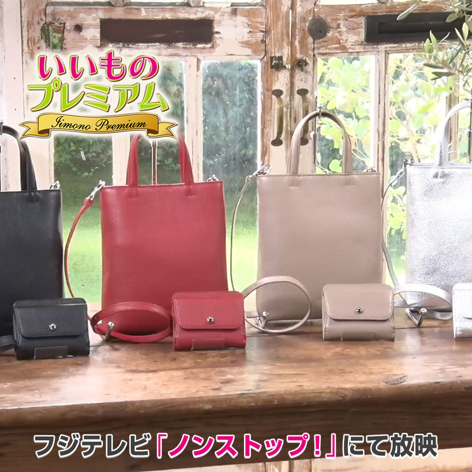 フジテレビ『いいものプレミアム』で放送10/14放送時【2,000セット以上】販売!ただ今大ヒット中人気のバッグブランド「バルコス」からコンパクトなのに必要なものはしっかり入る2way牛革バッグとスリムウォレットが登場!身軽に楽しみたい♪お出かけシーズンにぴったりな牛革バッグ & 財布普段の外出も旅行も「手ぶらで身軽に出かけたい!」と思いませんか?そんな方には、番組初登場の『バルコス 2way牛革手ぶらバッグ & スリムウォレットセット』がおすすめ!キャッシュレス時代の今はバッグも財布も小さめが人気です。とはいえ長財布派の方もいらっしゃいますし、スマホだけでなくメガネケースやエコバッグも入れたいし、お札は折らずに収納したい。つまり手ぶら感覚でお出かけしたいけれど、必要なものはちゃんと持っていきたい!という大人の女性のわがままにお応えしたのがこの牛革バッグとお財布のセットです。人気ブランド「バルコス」の牛革バッグとスリムウォレット「BARCOS(バルコス)」は世界最大級のバッグ見本市で、日本ブランド初のデザイン賞を受賞した実績を誇るブランド。番組でもこれまでバルコスのバッグ & 財布シリーズをご紹介しきましたが、デザイン、素材、機能性とも毎回好評!特に今回のバッグはありそうでなかった"ちょうどいい"サイズ感をバルコスが誇るデザイン力で美しく表現。シンプルながら高級感があり、価格以上の高見えが叶います。【BARCOS(バルコス)】1991年、鳥取県倉吉市で創業。2007年、イタリア・ミラノの皮革見本市「MIPEL(ミペル)」で日本ブランド初のデザイン賞を獲得し、その後も2回受賞。ニューヨークの展示会「コーテリー(Coterie)」、パリの展示会「プルミエールクラス(Premiere Classe)」にも出展。高いデザイン力と商品力が評価される、実力派ブランドです。【バッグ、財布とも牛革を使用!】バルコスは素材のよさにも定評があり、今回もこの価格帯ながら バッグはもちろん、スリムウォレットも大人にふさわしい牛革を使用。しっかりしているのにやわらかく、しなやかに手に馴染みます。さらにキズがつきにくく、ついても目立ちにくいシュリンク型押し加工を施しました。上質感ただよう本革製なのにガンガン普段使いができちゃいます。【牛革手ぶらバッグ】コンパクト & シンブルで高級感がある2way仕様大きいバッグは持ちたくない!でもスマホしか入らないミニショルダーでは事足りない…。そんな時には「牛革手ぶらバッグ」が本当に便利。コンパクトで可愛いサイズ感ながら、長財布、スマホ、エコバッグ、眼鏡ケース、ミニサイズなら折り畳み傘まで収納。ちょっとそこまでの外出から旅行まで幅広く活躍します。・ハンドバッグとして使える、持ち手のあるデザインが品よくおしゃれ。電車や病院の待合室で座った時や、車の助手席に置いたときもサッと持ち手を取れるのは便利です。・取り外し可能なショルダーストラップ付きで斜め掛けができるから、旅行や荷物の多い時にも重宝。またお好みのストラップに付け替えると印象を変えて楽しめます。・マグネットホック式開閉で、中身が見えにくいのはうれしい。・内側にオープンポケットとファスナー式ポケット、外側にもポケット付き。コンパクトでも機能はしっかり。【スリムウォレット】牛革バッグとお揃いの二つ折りタイプ「スリムウォレット」は牛革手ぶらバッグとお揃いのカラーをセット。もちろん素材もお揃いの牛革製で、シュリンク型押し加工を施した上質な質感。長財布派の方が サブ財布として使うのにも、おススメの使い勝手です!・ホック開閉の二つ折りタイプで、コンパクトでも お札を折らずに入れられます。・小銭入れは、ガバッと大きく開くボックス式。探しやすく出し入れしやすく、支払いの際モタモタしないですみそう。・カード入れは8、オープンポケットも2つ付き。カラーは4色、バッグとお財布をお揃いで!カラーは定番ブラック、上質感が際立つトープ、装いのアクセントになるシルバー、華やかなガーネットの4色をご用意。バッグとお財布がお揃いなら、オシャレ感がグンとアップします。